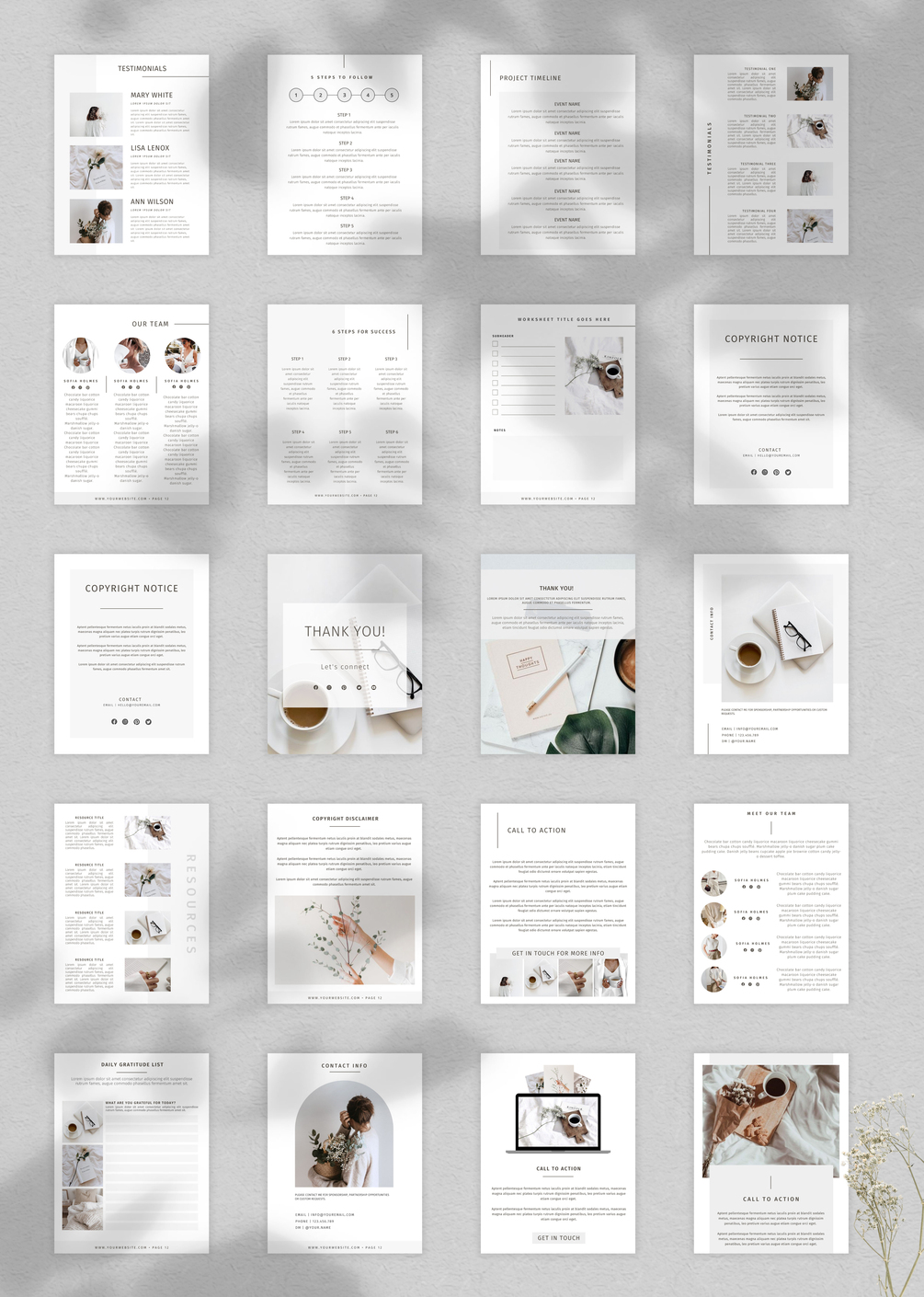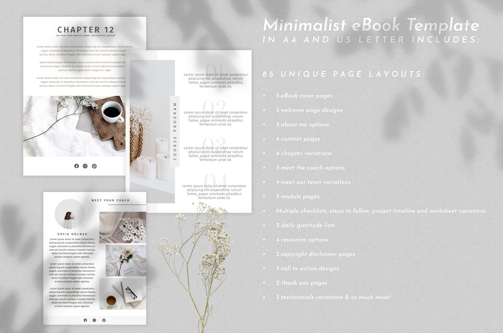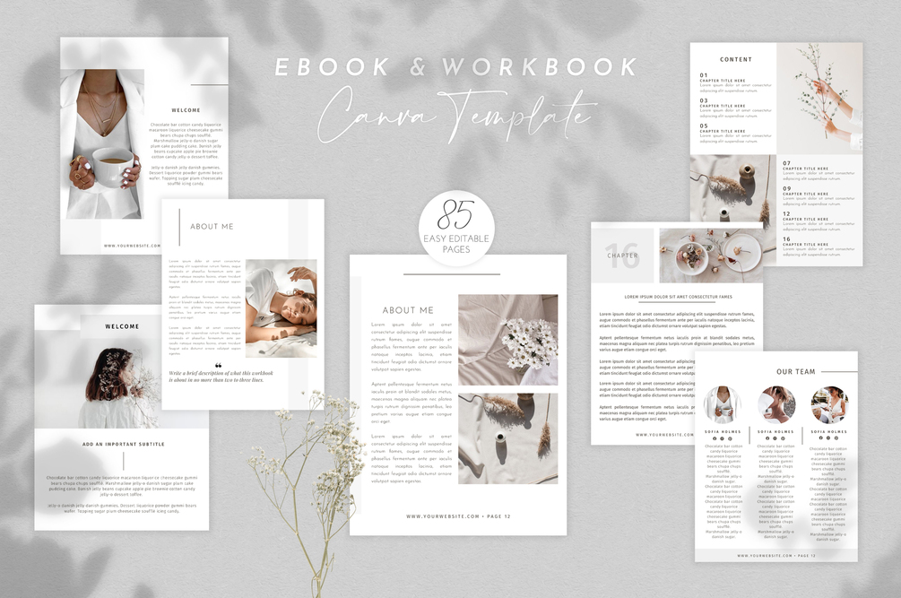Ebook Template for Canva | Workbook Canva Template for Course Creators - 85 pages in US Letter and A4 size. ♡ 5 eBook cover pages ♡ 5 welcome page designs ♡ 3 about me options ♡ 4 content pages ♡ 6 chapter variations ♡ 3 meet the coach options ♡ 4 meet our team variations ♡ 3 module pages ♡ Multiple checklists, steps to follow, project timeline and worksheet variations ♡ 2 daily gratitude lists ♡ 4 resources options ♡ 3 copyright disclaimer pages ♡ 5 call to action designs ♡ 2 thank you pages ♡ 3 testimonials variations & so much more!